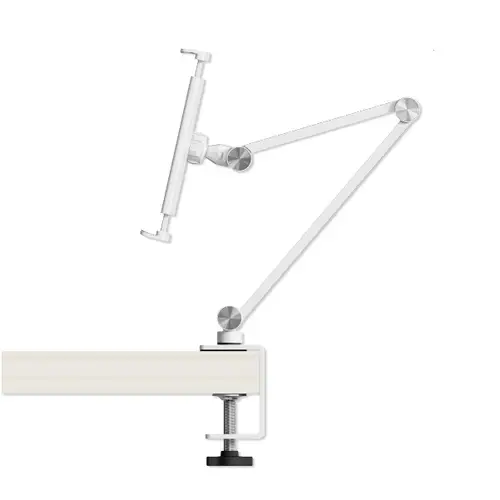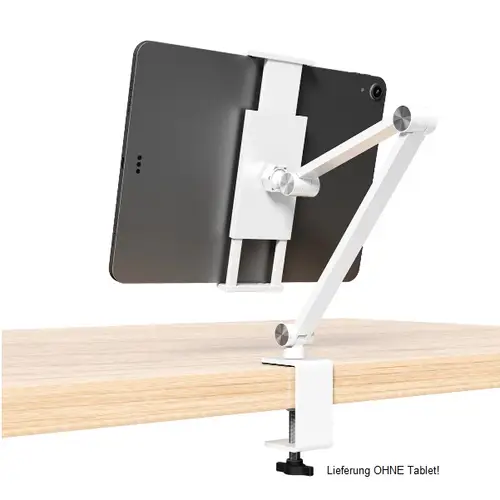 Hauptmerkmale • Stilvoll: Schickes Design aus hochwertigem Aluminium mit mattem Finish machen den ErgoFix zum Hingucker auf deinem Schreibtisch, in deiner Küche und überall sonst. • Praktisch: Klemme dein Gerät einfach zwischen die beiden Haltebacken oder nimm es wieder heraus. • Vielseitig: Der stabile Halterarm ist auf Wunsch verstellbar, neigbar, schwenkbar und 360° drehbar für eine optimale Positionierung. So kannst du Filme bequem im Querformat schauen oder Texte in der Hochformat-Position lesen. • Universal: Passend für nahezu alle gängigen Smartphones und Tablet-PCs von 4,7 - 15,6". • Variabel: Stufenlos verstellbare Krallen für die individuelle Anpassung und sichere Fixierung deines Gerätes. • Platzsparend: Wenn du ihn nicht verwendest, kannst du ihn in Windeseile abschrauben, zusammenklappen und platzsparend verstauen.Spezifikationen • Produktgröße: 400x170x170 mm • Für Geräte von 4,7" bis 15,6" • Drehbar 360° • Schwenkbar 180° • Neigbar 120° • Klemmengröße vom 125 mm bis 255 mmLieferumfang 1x Tisch-Halterung ErgoFix H9 weiß für Smartphones und Tablets 1x Sechskant-Schlüssel 1x Montageanleitung