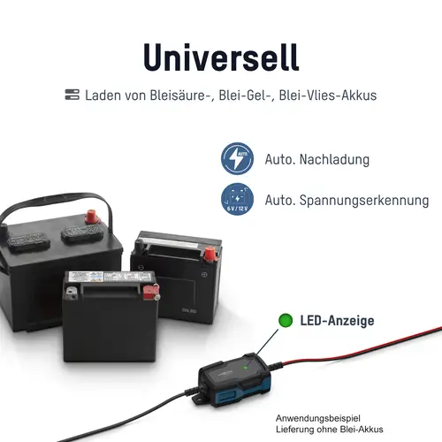 Nach Anschluss der Batterie erkennt das Ladegerät automatisch die Spannung der Batterie (6V oder 12V). Die LED-Anzeige blinkt grün während des Ladevorgangs und ist dauerhaft grün wenn die Batterie vollständig geladen ist.