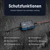 Das Ladegerät ist staub- und strahlwassergeschützt (IP65) und hat folgende elektrische Sicherheitsfeatures: Verpolschutz, Überladeschutz, Tiefentladeschutz und Kurzschlussschutz