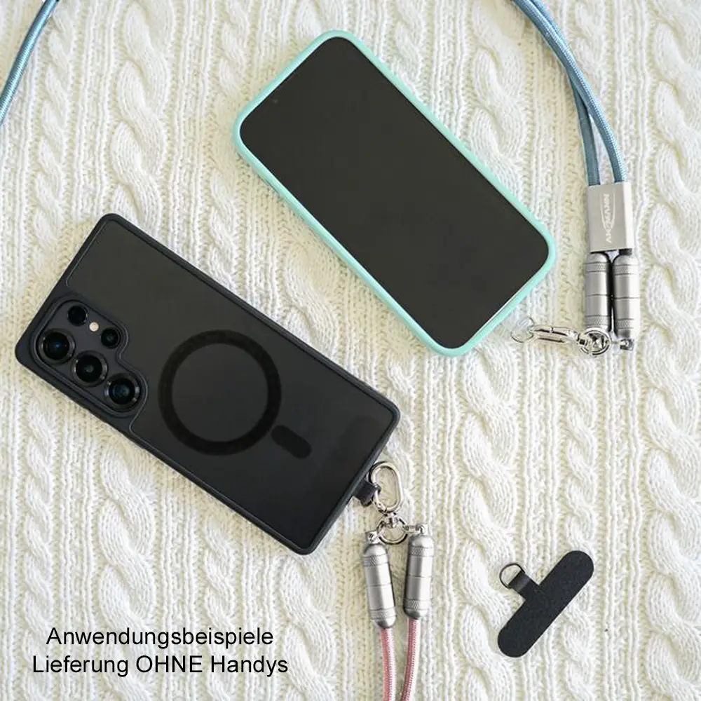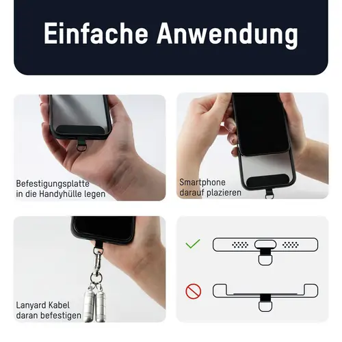 • Einfache Anwendung: Befestigungsplatte in die Handyhülle legen, Smartphone darauf platzieren, Lanyard Kabel daran befestigen