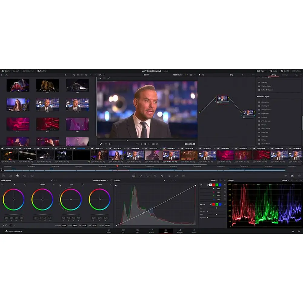 Die Technologie in DaVinci Resolve gehört zu den heutzutage bahnbrechendsten der Branche. Hinter vielen der mächtigsten Tools der Software steckt die DaVinci KI Neural Engine, ein fortschrittliches maschinelles Lernsystem, das voll von Apple Computern der M-Serien und Snapdragon X Elite unterstützt wird. Da nun auch die neueste Version von Dolby Vision integriert ist, können Nutzer HDR-Inhalte auf unterstützten Bildschirmen, einschließlich Laptops, sichten. Die zukunftssichere Grading-Umgebung der Farbräume DaVinci Wide Gamut und Intermediate erlaubt Ihnen die Arbeit mit Log-Bildmaterial aus beliebigen Quellen. Sie können in jedem heute gebräuchlichen Projektions-, Monitoring- und Archivierungsstandard ausliefern. Überdies ist DaVinci Resolve die einzige Software, in der Sie 8K-Bildmaterial in Echtzeit schneiden und farbkorrigieren können.