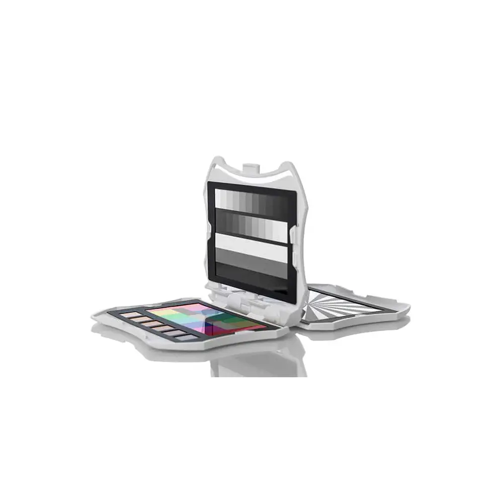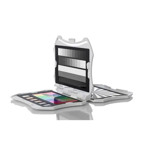 • Eine zum Patent angemeldete Videofarbzielkarte, die für eine präzisere, Videoverarbeitung mit nuancierter Farbgenauigkeit entwickelt wurde. Sie enthält 12 Farbfelder in einer einzigartigen Konfiguration mit einem schwarzen, einem grauen und einem weißen Farbfeld in der Mitte sowie 6 Hauttonfarben.