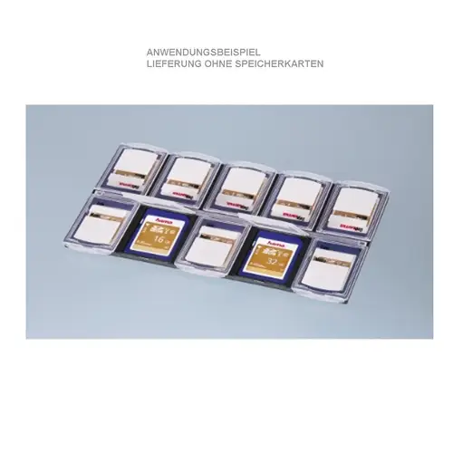 Hauptmerkmale• Box zur Archivierung von Speicherkarten• Platz für bis zu 10 Speicherkarten• flexible, bruchsichere Box schützt vor Beschädigung der Karten• mit beschriftbarem Datum- und Memofeld• extrem flach und platzsparend• passt in ein 10x15-Foto-Einsteckalbum