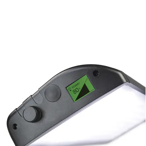 Je Leuchte 272 speziell selektierte weiße SMD-LEDs, 5600 Kelvin, CRI = 96. Das abgegebene Licht ist völlig frei von Infrarot- und UV-Anteilen, flimmerfrei und ohne Restwelligkeit. Leuchten einzeln oder synchron in 1 %-Schritten von 10 % bis 100 % dimmbar. Beleuchtetes Info-Display.