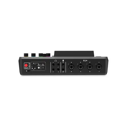 An die vier Neutrik-Combo-Buchsen auf der Rückseite kann man Mikrofone (XLR) bzw. E-Gitarre, Bass, Keyboards und andere Line-Quellen (6,35 mm) anschließen kann. Mikrofonsignale - auch solche von unempfindlichen dynamischen Sprechermikros - werden von den audiophilen „Revolution“ High-Gain-Preamps optimal und rauschfrei vorverstärkt. Verwendet man die Klinkenbuchsen, kann man für E-Gitarren die Impedanz menüseitig auf hochohmig umschalten.