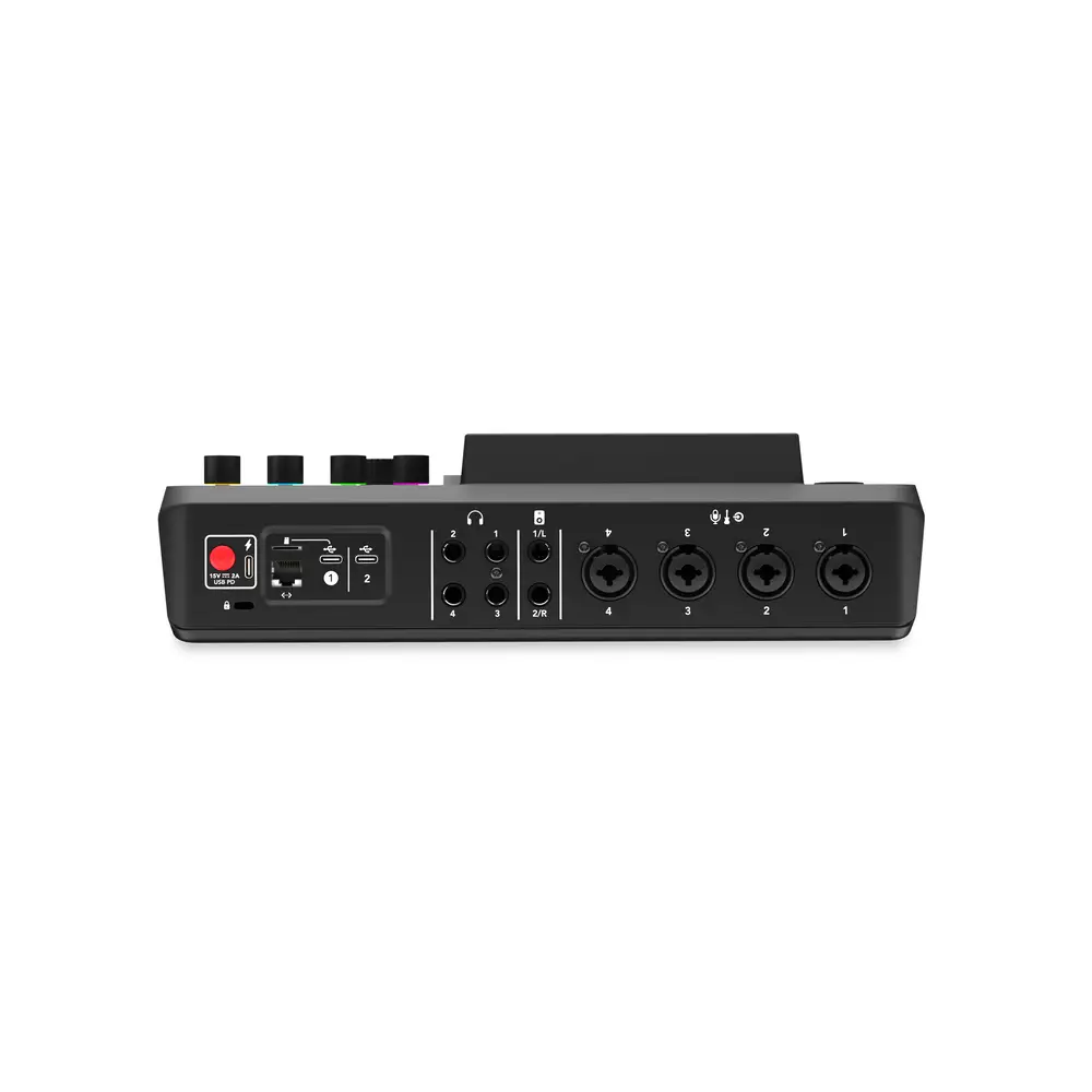 Das RODECaster Pro II hat ein Dual USB Audio Interface mit zwei USB-C-Buchsen und MFi-Zertifizierung für iOS-Geräte. Dies erlaubt das gleichzeitige Anschließen von zwei Rechnern (Mac/PC), zwei Android- oder iPhones oder eine Kombination davon. Man kann auch ein schnelles USB-Speichermedium anschließen, um dort aufzunehmen.