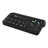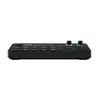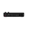 Die 25 cm breite Konsole bietet fünf Szenen- und vier Quellentaster, dazu AUTO, CUT sowie die 6 Funktionstaster Fade to Black, Media, Overlay, Multi Source, Keying und Inspect. Auf der Rückseite finden sich drei HDMI Eingänge, ein HDMI Ausgang, vier USB-C Ports, zwei 6,35 mm TRS-Buchsen für Kopfhörer sowie zwei Combo-Buchsen (XLR/6,35 mm) für Mikrofone und Line-Quellen