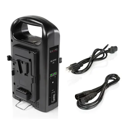 Hauptmerkmale:• V-Mount• Akkuladung wird durch LEDs angezeigt• 4-Pin XLR Wechselstrom Output• 16,8V, 3,0A Ladegerät Output• Schalter mit drei Einstellungen: Aufladen, Gleichstrom Out, Aus• Beinhaltet ein 4-Pin XLR Male-Female Kabel, um anderes Zubehör mit Strom zu versorgen• Stromeingang: 90-242V, 47-63Hz, 3,8A Gleichstrom• Produkt Dimensionen: 24,5cm x 15cm x 8,5cm, Gewicht: 1kg• Ein Stromkabel und ein 4-Pin XLR Kabel im Lieferumfang