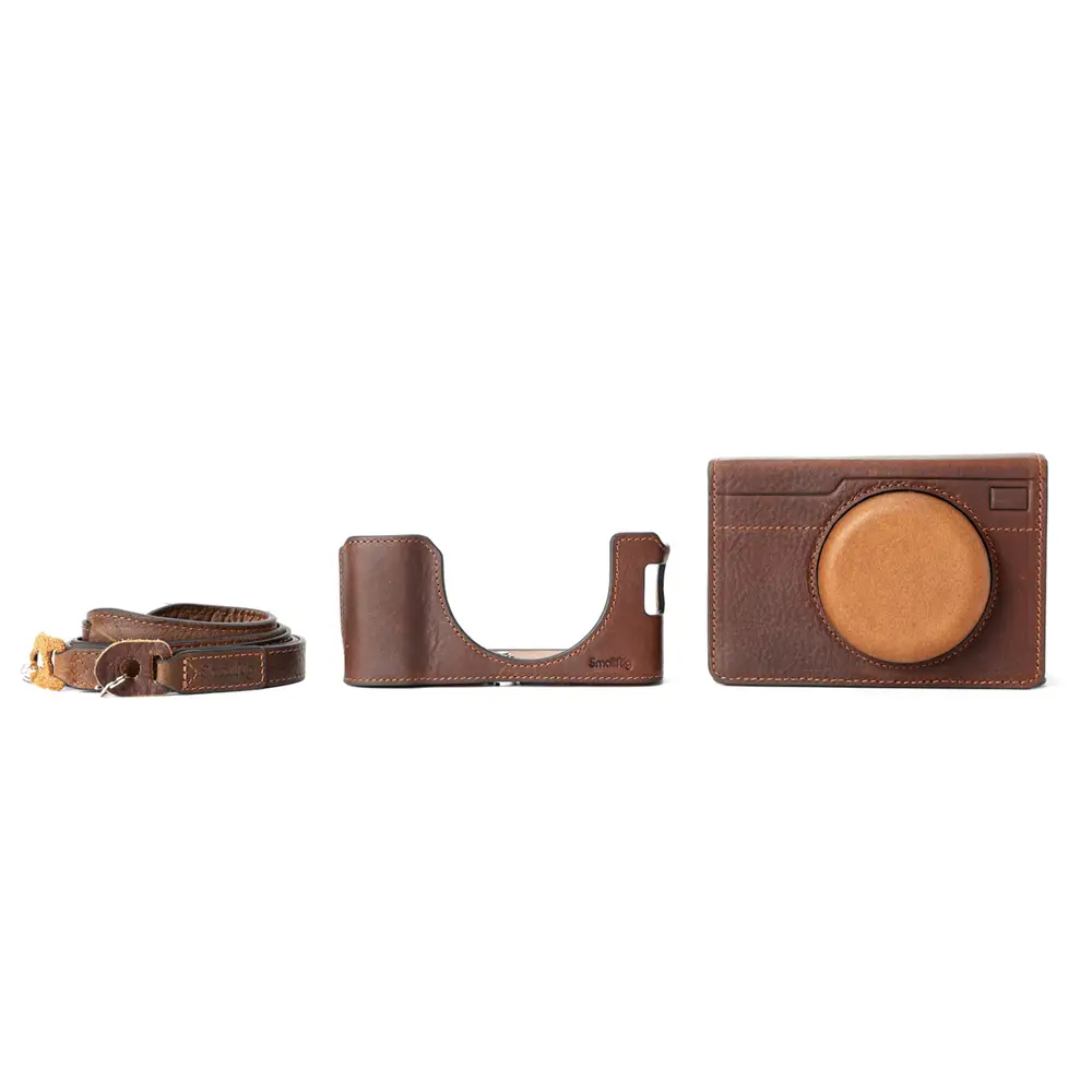 Das Kit umfasst eine Leder-Halbschale, eine Flip-Case-Hülle und einen Schultergurt. Sowohl die Außenseite der Ledertasche als auch die Flip-Case-Hülle bestehen aus atmungsaktivem und verschleißfestem Rindsleder auf der ersten Schicht und greifen die Silhouette der Kamera auf, um einen auffälligen Stil zu schaffen. Die Innenseite besteht aus weicher Mikrofaser, um Kamera und Objektiv rundum zu schützen.