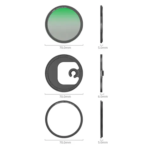 Das magnetische Befestigungssystem ermöglicht dem Benutzer ein schnelles und effizientes Anbringen und Austauschen der Filter. Das Set enthält einen M-Mount-Adapterring für die direkte Integration mit der M-Mount-Rückwandplatine von iPhone-Cages.