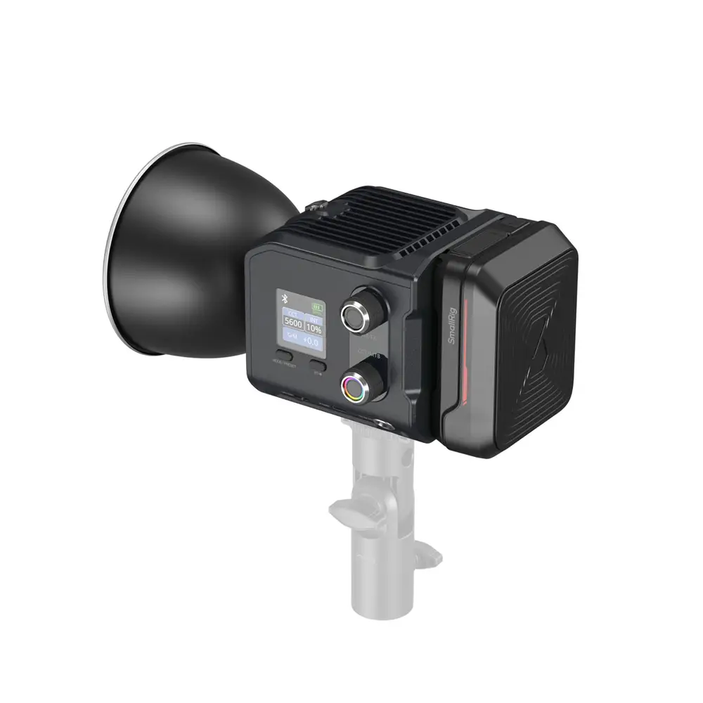 Die Leuchte bietet vielseitige Stromversorgungsmöglichkeiten und ermöglicht den kabellosen Betrieb mit V-Mount- oder NP-F970-Akkus. Sie kann außerdem über einen USB-C-Anschluss mit Zubehör wie einem Handgriff, einer PD-Powerbank, einem Ladekabel sowie einem AC/DC-Netzteil aufgeladen werden. Die im Lieferumfang enthaltene SH73 Grip Handle Designed Powerbank ermöglicht eine Laufzeit von bis zu 45 Minuten bei maximaler Leistung. Die integrierte V-Mount-Akkuplatte sorgt für unterbrechungsfreie Aufnahmen durch schnellen Akkuwechsel.