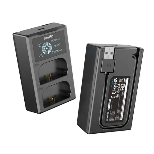 Jeder Akku liefert eine Nennleistung von 2520 mAh und bietet damit eine längere Aufnahmezeit für anspruchsvolle Arbeitsabläufe. Das Ladegerät ist mit zwei unabhängigen Steckplätzen ausgestattet, die das gleichzeitige Laden von zwei Akkus oder eines einzelnen Akkus ermöglichen und so die Effizienz bei Konfigurationen mit mehreren Akkus optimieren.