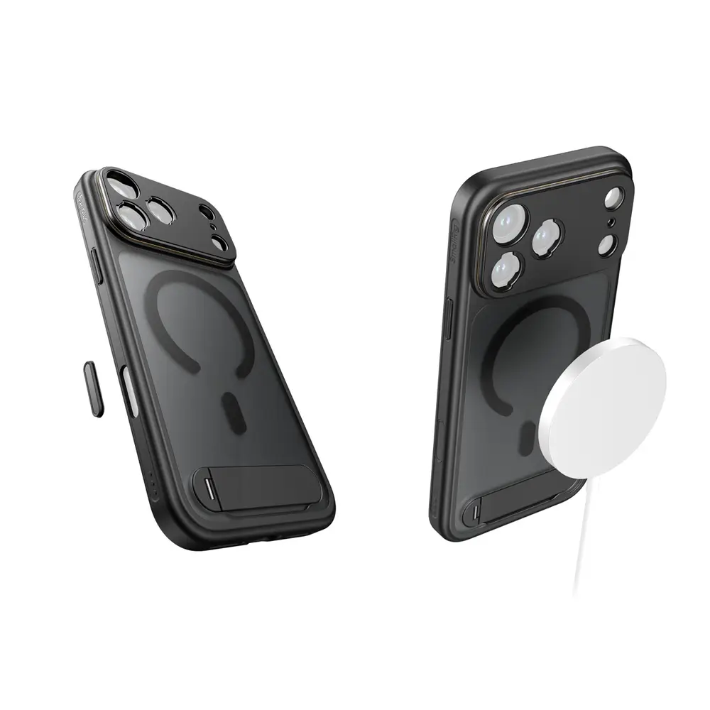 Eingebaute MagSafe-Magnete gewährleisten universelle Kompatibilität mit MagSafe-Zubehör, während eine seitliche Öse die Befestigung von Handgelenk- oder Schultergurten für bequemen Transport unterwegs erleichtert.