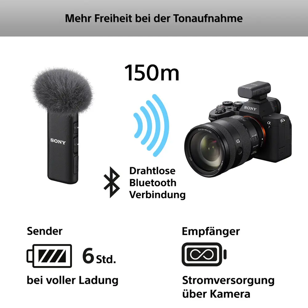 Mehr Freiheit bei der Stimmaufzeichnung: Ganz gleich ob Interviews oder Reiseaufzeichnungen – Überall eine klare Stimmaufnahme. Kompakt, mit langer Akkulaufzeit (Sender bis zu 6 Stunden, Empfänger von der Kamera betrieben) und kabelloser Reichweite von bis zu 150 m* ermöglicht es hervorragende Audioaufnahmen auch unterwegs.