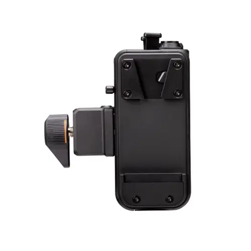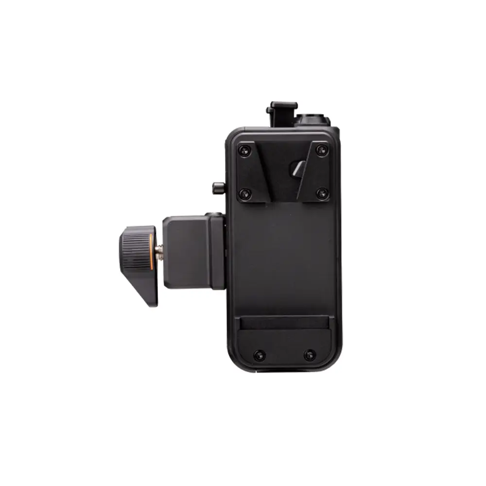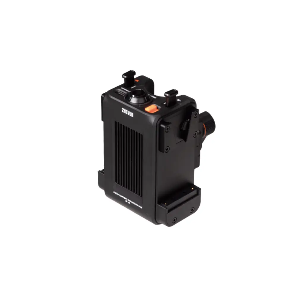 Die Leuchte verfügt über eine Akkuplatte mit V-Anschluss, die mit handelsüblichen Akkus mit V-Anschluss kompatibel ist. Hoch integriert, um Kabelsalat zu vermeiden. Der Akku fungiert sowohl als Griff wie auch als Stromquelle – Strom ist keine Last mehr und der Akku definiert das Benutzererlebnis einer professionellen Beleuchtung neu.