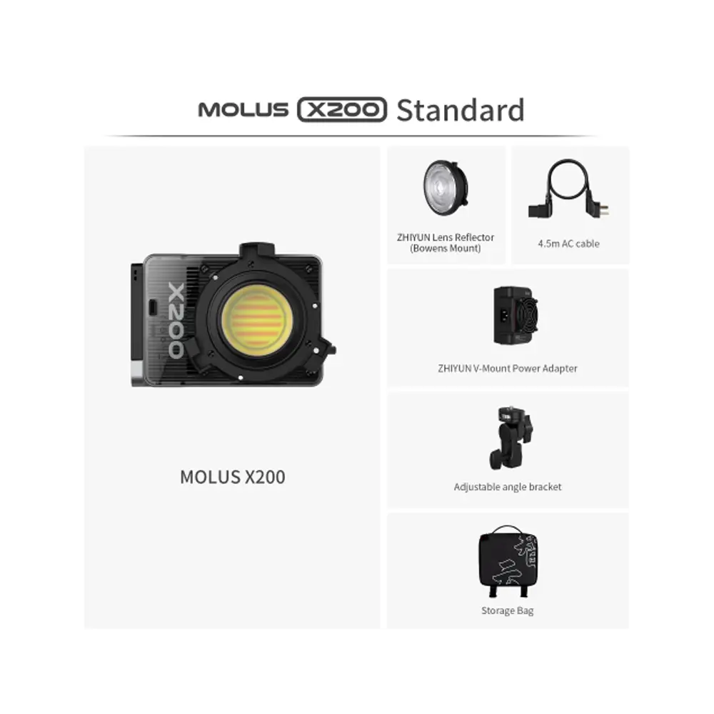 Mit ihren doppelt gekrümmten sekundären Reflexionsprismen, den dreifach gekrümmten homogenisierenden Fly-Eye-Linsen und den doppelt gekrümmten zentralen Homogenisierungsprismen erreicht die ZHIYUN MOLUS X200-Serie eine Beleuchtungsstärke, die 500 W entspricht, und das mit einer natürlichen Weichheit, die fast an die einer blanken Leuchte heranreicht und somit den Einstieg in die professionelle Filmbeleuchtung ermöglicht.